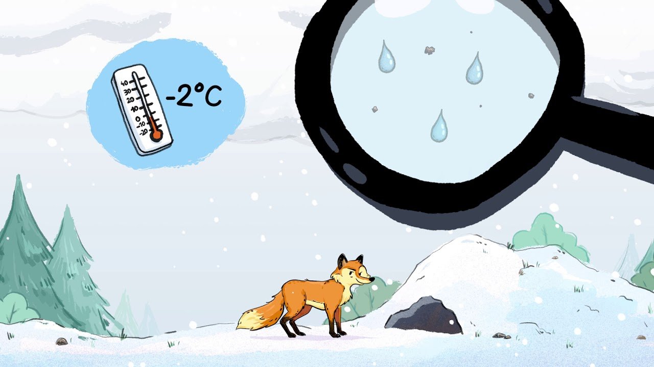 Courte vidéo expliquant comment se forment les flocons de neige dans les nuages : petites gouttes d’eau qui gèlent autour d’une poussière, croissance de cristaux de glace à six branches, chute des flocons vers le sol lorsque l’air est assez froid et humide.